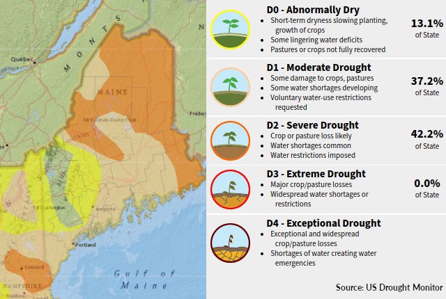 According to the US Government Drought Monitor, since 2000, the longest duration of drought (D1-D4) in Maine lasted 110 weeks beginning on June 19, 2001 and ending on July 22, 2003. The most intense period of drought occurred the week of January 08, 2002 where D3 affected 61.67% of Maine land.