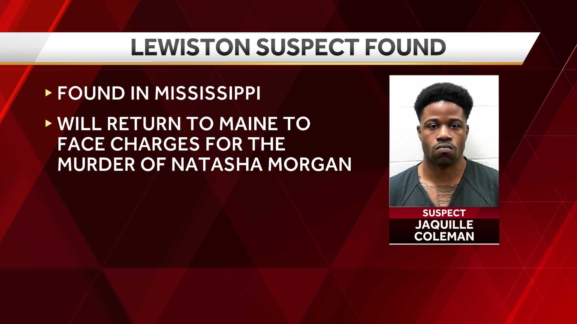 WMTW Man wanted for Lewiston murder found in Mississippi August 27, 2020August 27, 2020 DailyMainer.com 0 Comments crimeJaquille Coleman wanted for shooting death of Natasha MorganRead More
