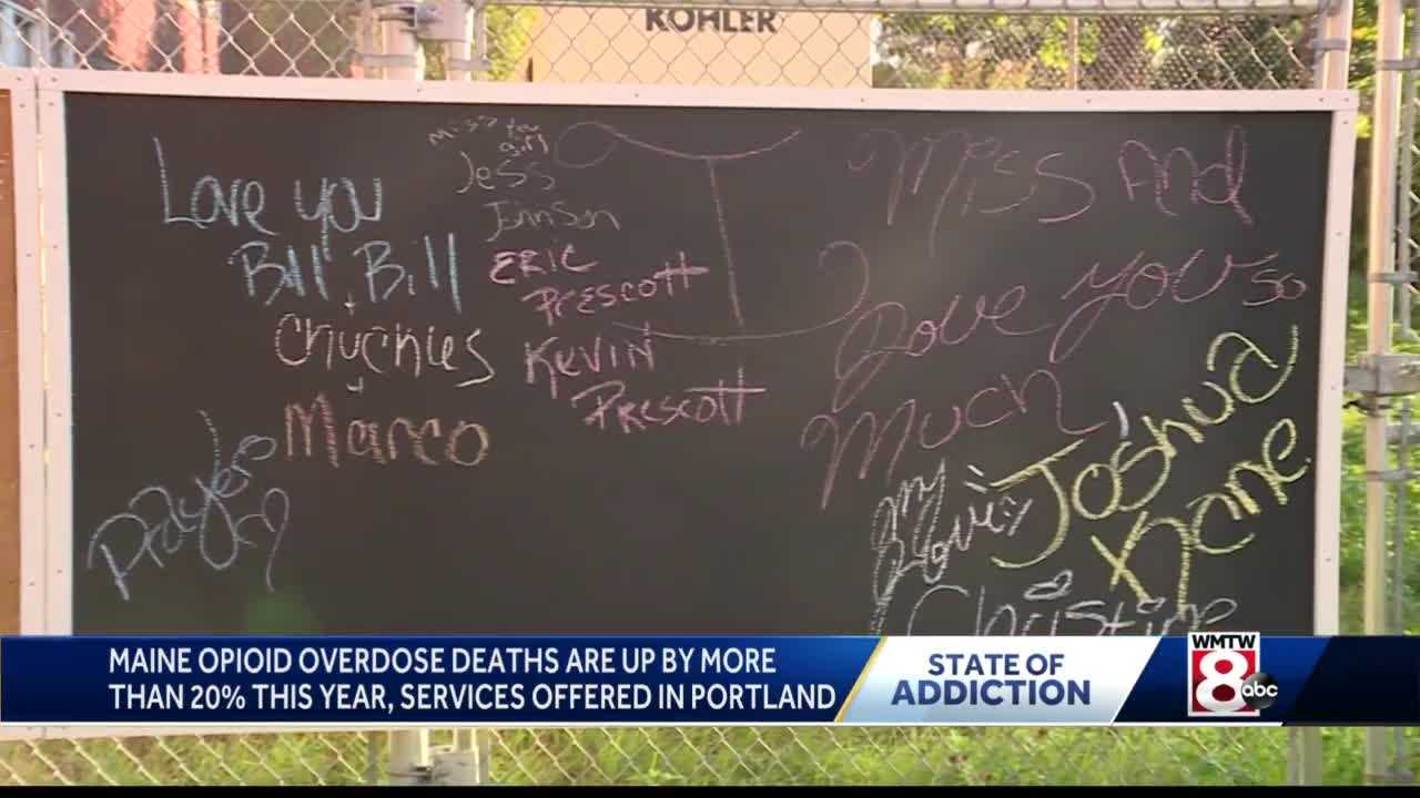 A memorial wall at the India Street Public Health Center in Portland is bringing attention to an increase in overdose deaths amid the pandemic.